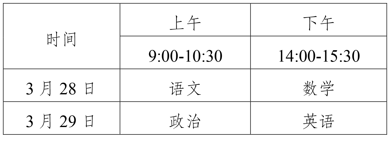 2.文化考试科目为语文、数学、政治、英语四科,每科满分为150分,四科满分为600分,使用国家通用语言文字作答。